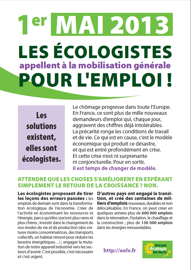 Les écologistes proposent de tirer les leçons des erreurs passées : les emplois de demain sont dans la transformation écologique de l’économie. Créer de l’activité en économisant les ressources et l’énergie, parce qu’elles s(er)ont plus rares et plus chères ; investir dans le changement de nos modes de vie et de production (des voitures moins consommatrices, des transports collectifs, un habitat rénové pour réduire les besoins énergétiques…) ; engager la mutation de notre appareil industriel vers les secteurs d’avenir. C’est possible, c’est nécessaire et c’est urgent. D’autres pays ont engagé la transition, et créé des centaines de milliers d’emplois nouveaux, durables et non délocalisables. En France, on peut créer en quelques années plus de 600 000 emplois dans la rénovation, l’isolation, le chauffage et la construction ; plus de 130 000 emplois dans les énergies renouvelables.