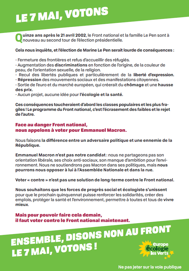 Ensemble disons non au Front. Le 7 mai votons ! Face au danger Front National, Europe Ecologie les Verts appelle à voter Macron. Partager : Cliquer pour partager sur X(ouvre dans une nouvelle fenêtre) X Cliquez pour partager sur Facebook(ouvre dans une nouvelle fenêtre) Facebook J’aime chargement… Similaire