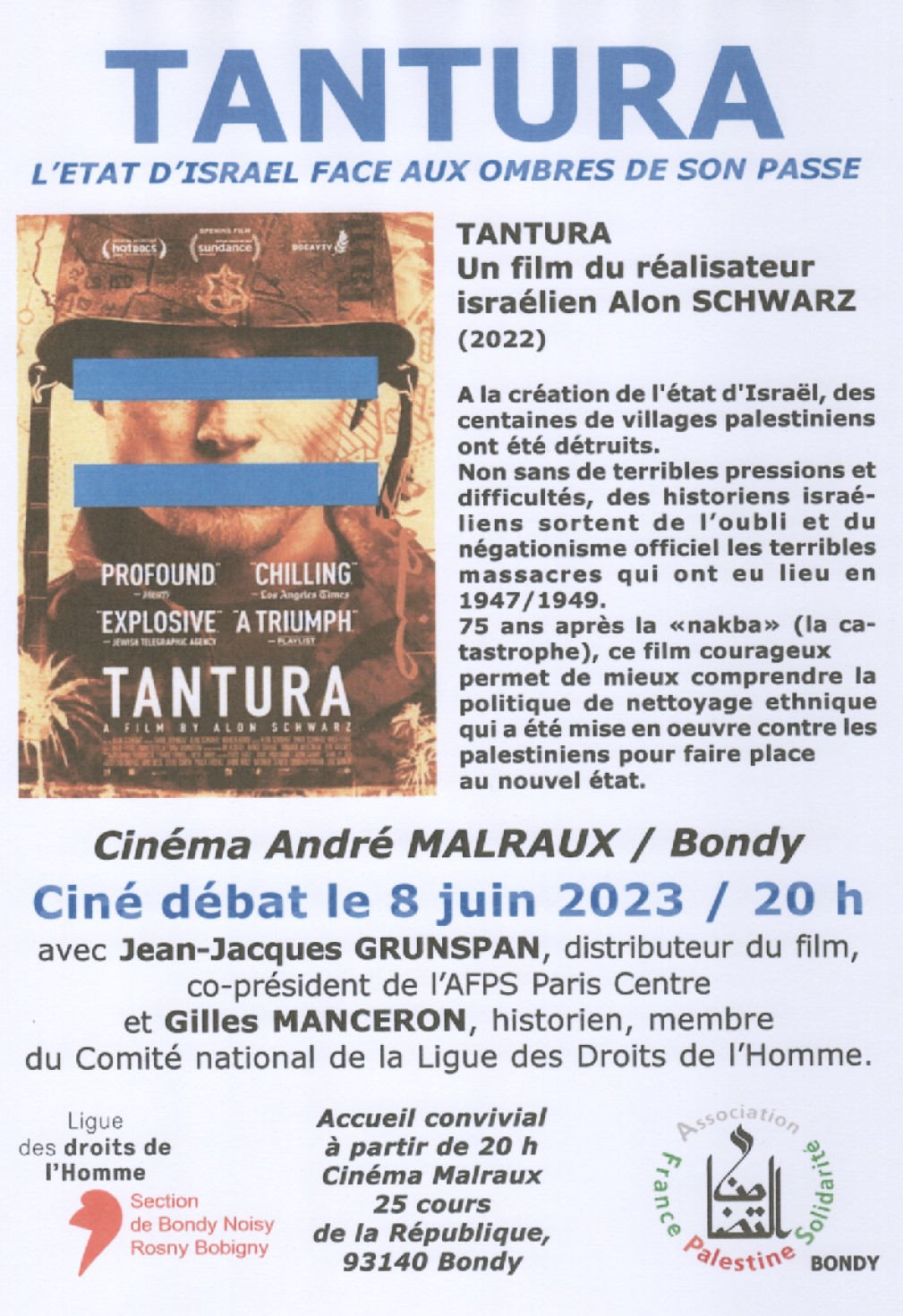 La ligue des droits de l’homme (Section de Bondy Noisy Rosny Bobigny) et l’Association France Palestine Solidarité (Bondy) vous invitent à un ciné débat le 8 juin à 20h.