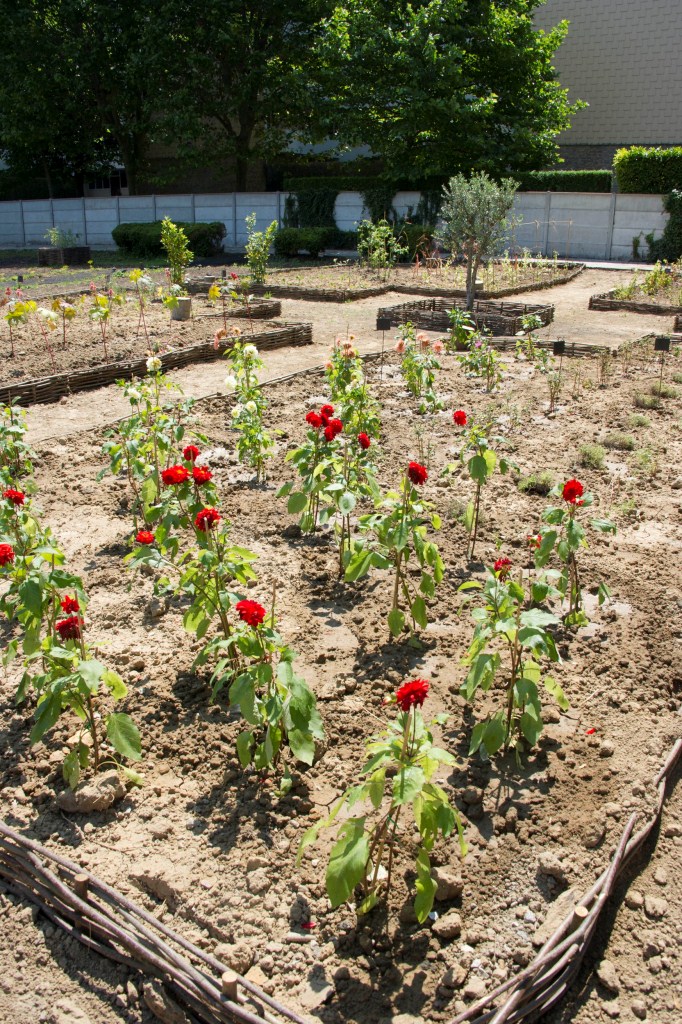 • Un jardin médiéval : jardin disposé en forme de croix, qui symbolise la protection. Au centre une fontaine symbolise la vie. N’ayant pas la possibilité de mettre une fontaine, nous y avons mis un olivier, au-dessus duquel une gloriette sera  installée prochainement.  A l’époque, le jardin avait avant tout une fonction nourricière. C’est pourquoi il est divisé en 4 parties : Les légumes d’autrefois, les dahlias (qui étaient consommées à l’époque), les plantes médicinales et les plantes aromatiques.
