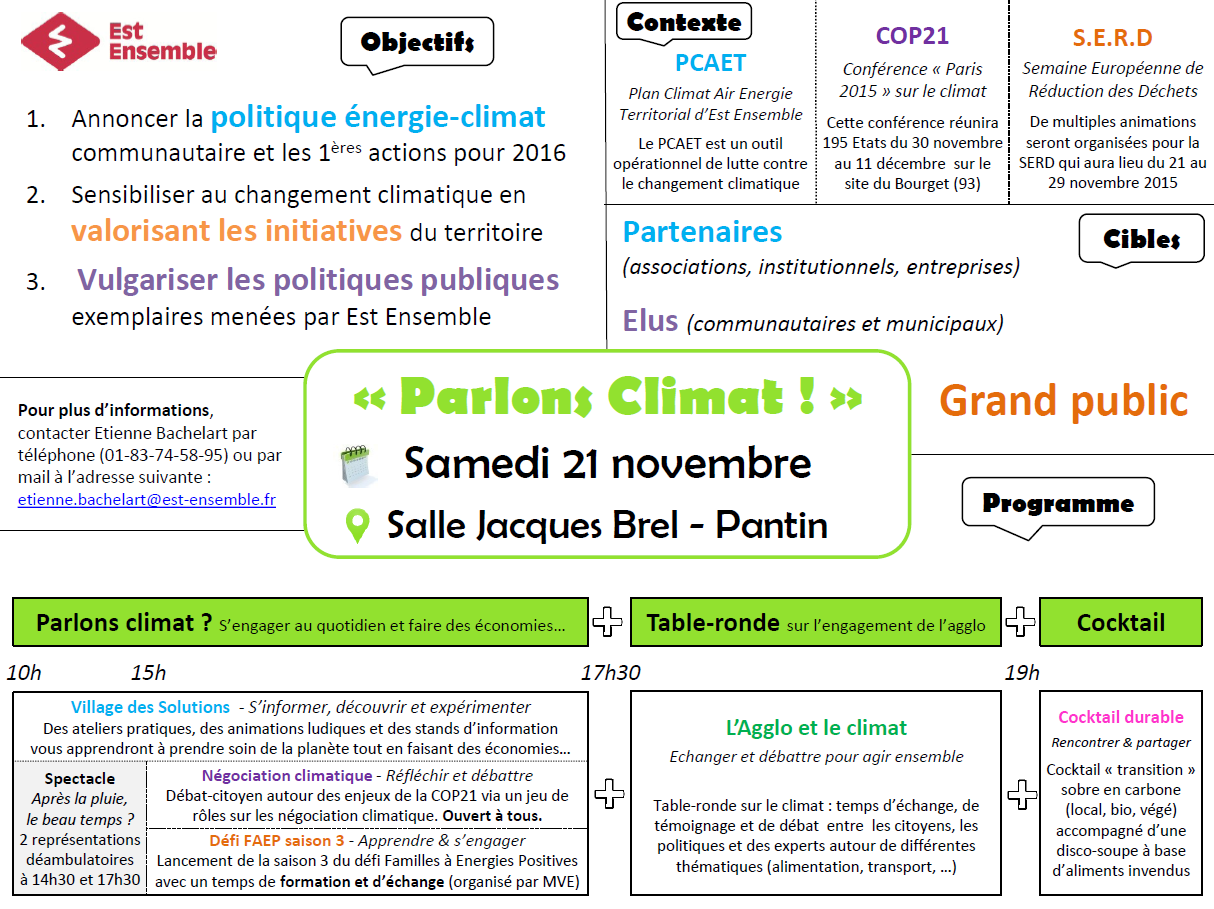 La COP 21 arrivant à grands pas, l’agglomération a décidé de valoriser ce travail mené sur une année !! Alors le Samedi 21 novembre, venez parler climat à Pantin !!
